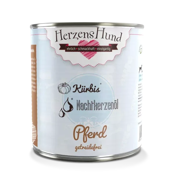 Pferd ist oft für allergiegeplagte Hunde der letzte Ausweg und eine sehr bekömmliche Proteinquelle. Bei der Zusammensetzung des Fleischanteils steht hochwertiges Muskelfleisch ganz vorne, das wichtige Proteine bietet. Doch auch Herz und Leber sorgen für einen Vitamin-Boost mit viel Vitamin A und B-Vitaminen sowie Aminosäuren. Für die Sensiblen haben wir die Zutatenliste bei diesem Menü extra kurz gehalten; abgerundet wurde der hohe Fleischanteil mit nährstoffreichem Kürbis. Nachtkerzenöl mit Omega-6-Fettsäuren kann Fell und Haut guttun.
