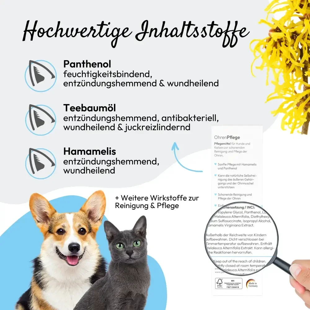 Die Ohren von Hunden und Katzen können durch äußere Einflüsse oder gestörte Selbstreinigung stark verschmutzt sein. Das kann zu unangenehmen und schmerzhaften Reizungen des äußeren Gehörgangs und der Ohrmuschel führen. Das Tier reagiert darauf mit übermäßigem Kratzen am Ohr. Dies verstärkt die Reizung der Haut im Ohrenbereich zusätzlich. Bei regelmäßiger Anwendung fördert PHA OhrenPflege die natürliche Selbstreinigung des äußeren Gehörgangs